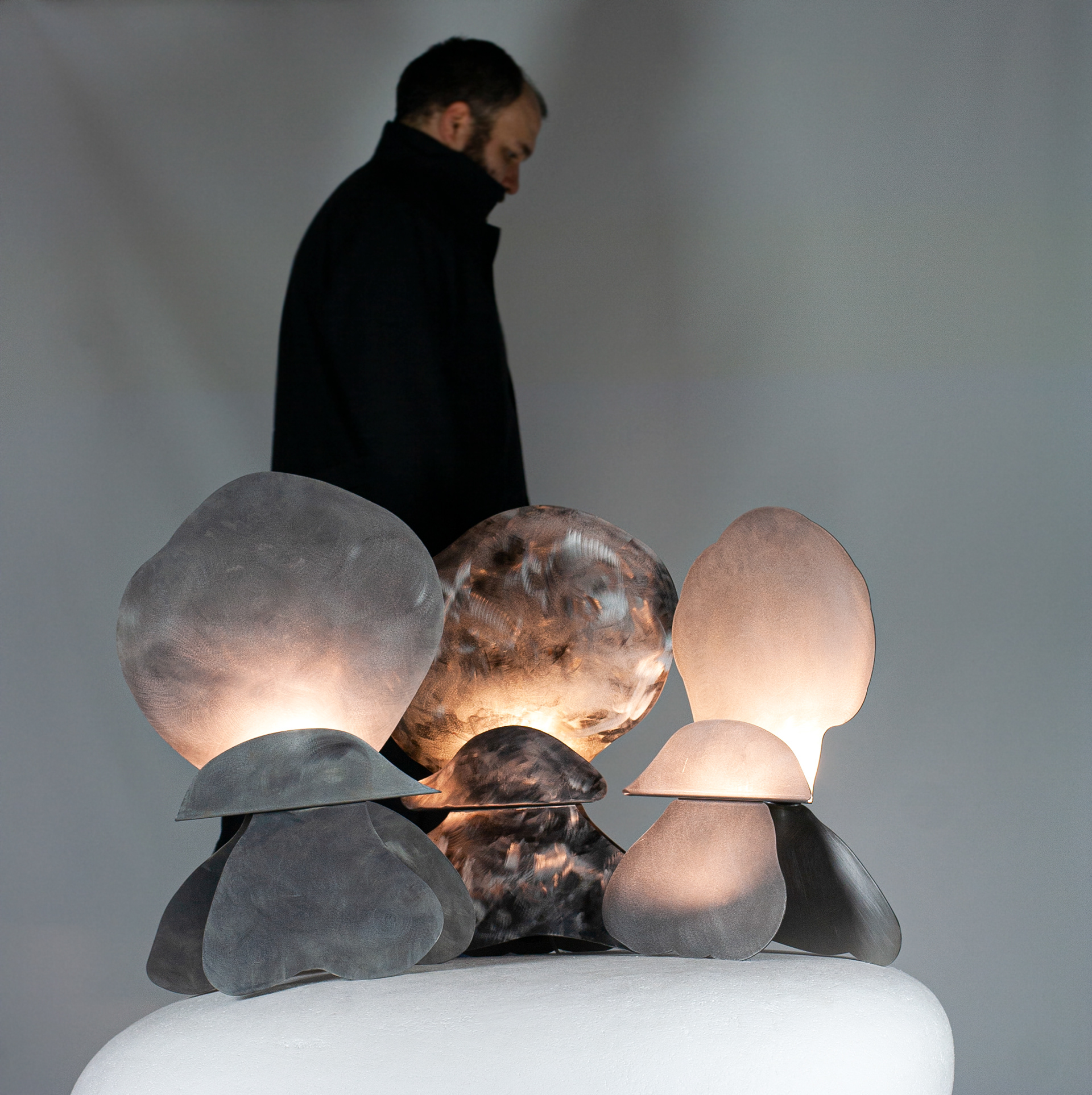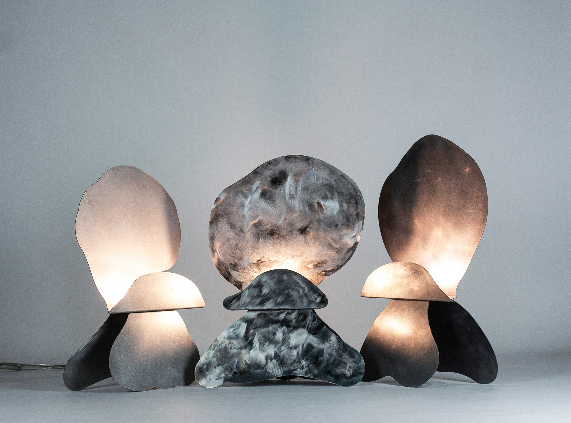 Светильники POLYUSHKO подражают рассвету в полях, игре зарождающегося дня в небесном своде. Размер светильника позволяет использовать его в качестве мини торшера или настольной лампы. Металлический лист мягко отражает свет, а поверхность металла, обработанная вручную, придает каждой лампе индивидуальный характер. Могут быть изготовлены из различных металлов, таких как медь, титан, нержавейка, латунь. 2024г.